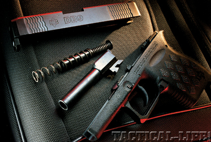 Despite its diminutive size, the DB9 packs six rounds of 9mm and keeps all of the ingenious features that have made the original DB380 so popular. The frame is a glass-reinforced polymer, and the barrel and slide are made from billet 4140 through-hardened steel, machined out of a solid block of chromoly. The slide and barrel are designed using Finite Element Analysis, a method that measures the elasticity and structural integrity of mechanical parts to ensure their strength and durability. Internally, the dual telescoping recoil springs inside are extremely effective but make for a stiff slide.