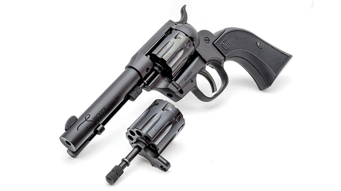 Back in the day, Hollywood had a fixation on the “fast gun” in many of its Western films. Sometimes an actor couldn’t manipulate a single-action revolver like the Colt Single Action Army (SAA) quickly enough. So, they would sometimes substitute it with a double action (DA) revolver made to look like a single action (SA) revolver. This was easily accomplished by adding a fake ejector rod housing on the right side of the barrel. There may or may not have been other cosmetic changes. And the movie makers counted on the audience, taking little notice of the sixgun in the hand of the star. Similarly, the Sidekick from Diamondback Firearms features an equally deceiving appearance.
