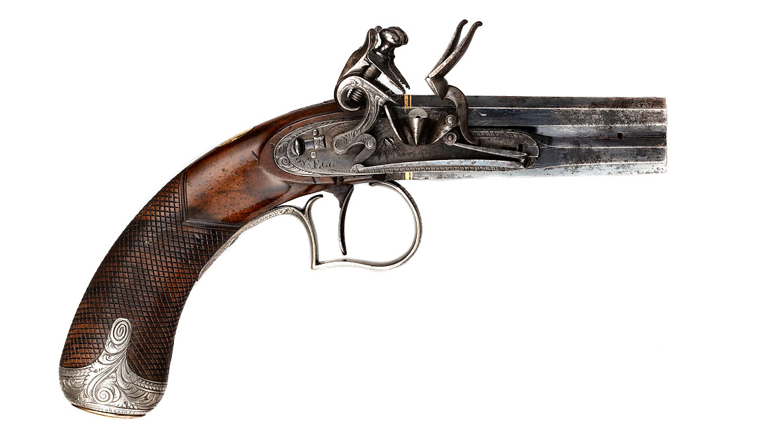 The double-barrel flintlock pistol appeared in Europe during the periods from the mid 1700s to the early 1830s. Percussion lock designs, which vastly improved loading, carrying and accuracy later replaced it. Interestingly, the double-barrel Flintlock pistol’s predecessor, the intricately-built wheellock, was also manufactured as a double-barrel pistol in the mid-1500s.