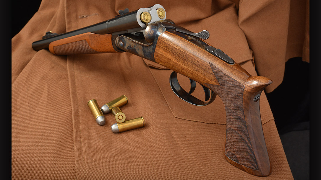 The double-barreled pistol is a very old design dating back to smoothbore double-barreled wheellock pistols from the 1600s. Flintlock designs, may have been the “inspiration” for sawed-off doubles from the mid to late 19th and early 20th centuries. The latter manufactured in the United States by Ithaca Gun Co. from the early 1920s to mid-1930s as sawed-off shotguns. But reproduced today as a rifled-barrel pistol by Pedersoli and chambered in .45 Colt.