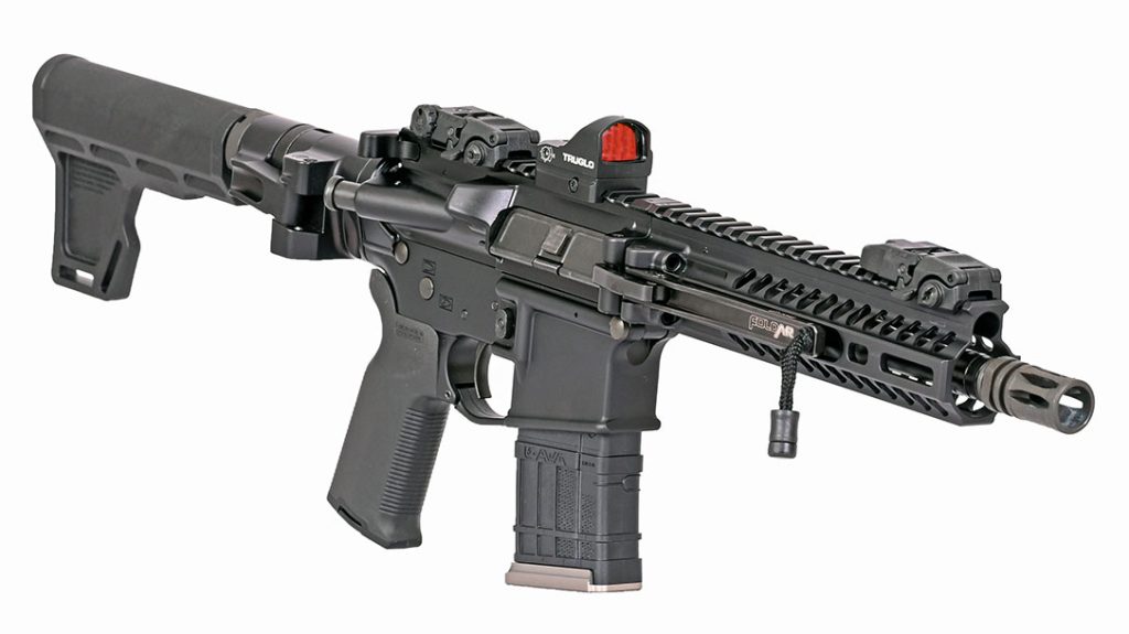 The pistol also features a modified and shortened Bootleg, Inc. Adjustable gas bolt carrier group to accommodate the folding abilities of the brace.