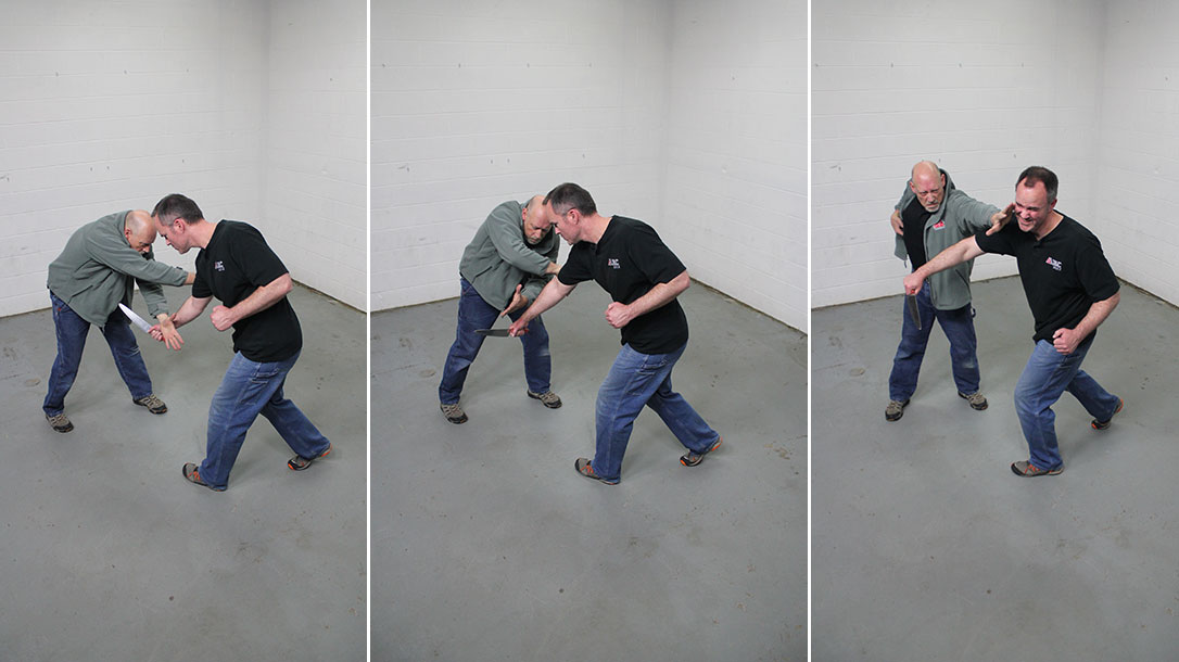 Against the aforementioned knife attack, your first priority should be to not get stabbed. A strong, two-handed block consistent with the body’s instinctive startle response is a good place to start. From there, execute an immediate counter that debilitates your attacker at least momentarily.
