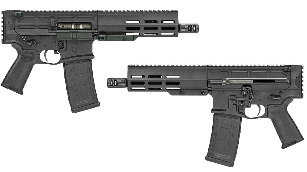 The MFP-21 uses DRD’s hallmark take-down system but diverges from the company’s AR-15-inspired CDR pistols in its overall design. The MFP-21 pistol uses a similar internal recoil system to those in the Paratus and Aptus series of rifles. This means that the recoil system is contained within the firearm itself and is not dependent on a buffer-tube assembly to function.