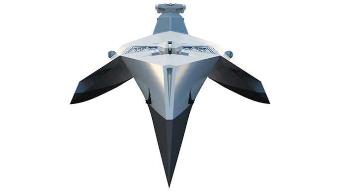 The ship does away with the traditional mast, using instead a quad-copter tethered to the ship with carbon nanotubes that would carry power for sensors and a laser gun to take out nearby threats.