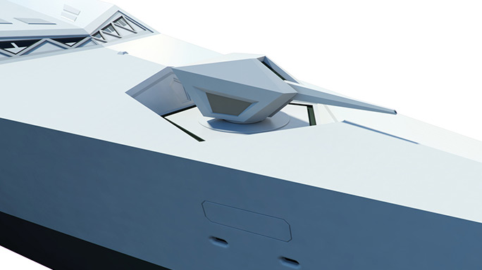 For threats farther off, there’s an electomagnetic rail gun on the bow that can fire a projectile hundreds of miles. Tubes in the two outrigger hulls would be armed with “supercavitating” torpedoes, which go so fast that they vaporize the water around them and create an air pocket that lets them fly through the water.