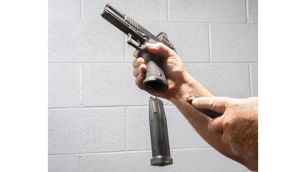 Set up a practice space that provides all the room you need, including proper lighting. Remove any live ammunition from the room. Check your clothing, especially your pockets, and anything within reach to make sure no live ammunition can be introduced. And all the basic safety rules still apply. Never point your firearm at anything you are not prepared to destroy. This may sound counterintuitive since you are dry, but it’s a rule to live by.
