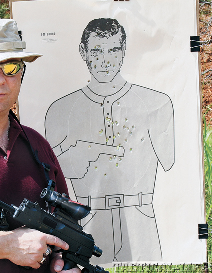 For me, the most impressive test was yet to come. We set up several pepper poppers at 15 yards, and I began drilling one steel silhouette after another in rapid succession. Moving back another 5 yards, I continued the drill, quickly hammering each popper in rapid succession, never failing to get hits on each slab of steel. Not only was this very satisfying, but the value of being able to engage numerous staggered targets so quickly and effectively is obvious.