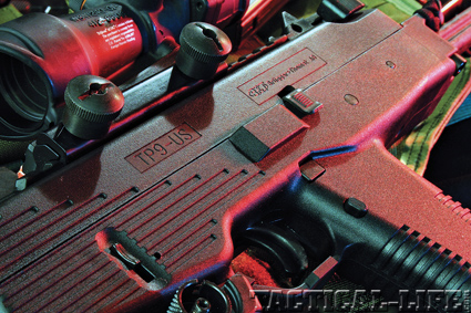 Essentially, the TP-9 9mm select-fire polymer-framed pistol of innovative design with integral Picatinny rails on top and bottom to allow a modular attachment of accessories, such as optics, tactical lights, and foregrips. Upper and lower receivers are made of high-impact resin polymer. The configuration of the muzzle also allows instant attachment of suppressors.