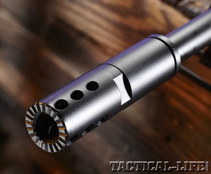 The barrel has a Belgian Short Flash Suppressor” that features a serrated face and four groups of three venting ports around its circumference