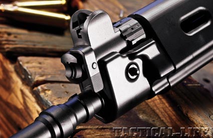 As I expected, the gun ran like a champ for the rest of the test, which entailed a few hundred rounds. And I was surprised by the gun’s accuracy, particularly with open sights. Although the majority of the groups were around the upper 2- to 3-inch range, I got some tight “best” groups (including a 1.55-inch group with the 150-grain Federal load). Being that I was fighting a 9.25-pound trigger pull and using iron sights, I was extremely impressed with the results. Recoil was manageable but notable (no surprise, considering it is a carbine-length 7.62mm with a metal, folding stock). I did note one minor quirk: The carry handle could not fully fold down alongside the right of the receiver when the stock was folded.