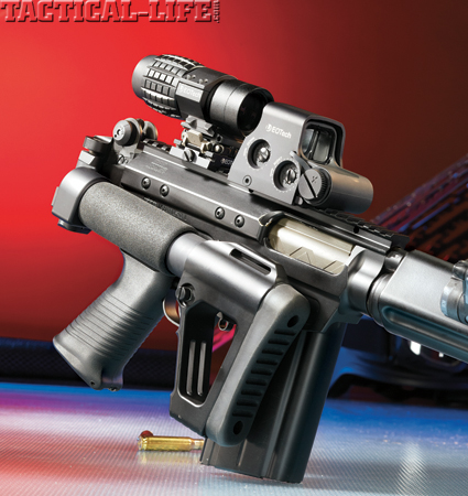 The Para Tactical is shown equipped with an EOTech XPS2-0 HWS backed up by an EOTech G23.FTS 3X magnifier unit on a flip-to-side mount. Mounted on the forend is an Insight Technology M6X-G white light/green laser unit.
