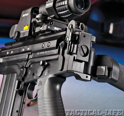 To further shorten the carbine, DS Arms incorporated a side-folding stock system, as pioneered by FN, indicated by the “Para” in this particular rifle’s designation. Employing a folding stock is no simple feat on a FAL, as the original design has the recoil spring assembly extending back into the buttstock. The solution is to relocate the spring assembly above the action, under a proprietary top cover.