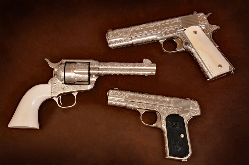 The pattern books of 19th century engravers, particularly the works of Gustav Young and Louis Daniel Nimschke, have long been the inspiration for the work of 20th and 21st century engravers, particularly at Colt’s, which brings us to the trio of Colt pistols pictured. Representing three different decades in Colt history, each is engraved in styles with their origins rooted in the late 19th century works of Gustav Young, his successor at Colt’s, Cuno A. Helfricht, and engraver Louis Daniel Nimschke, who established what is known as the “New York Style” of engraving, seen on firearms sold through prominent high-end 19th century retailers Schulyer, Hartley & Graham, and Tiffany & Co.