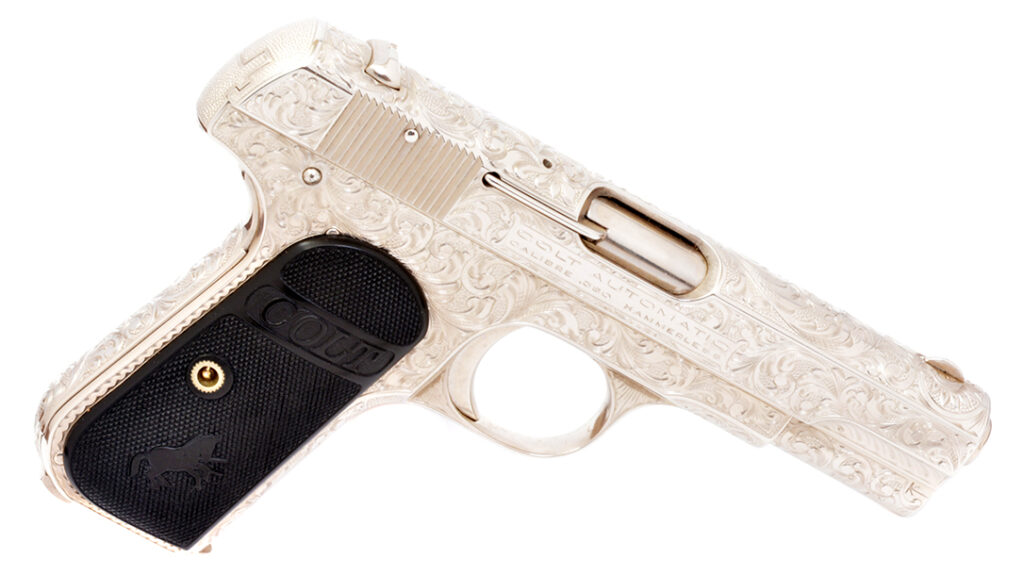 Pictured above are two examples of Browning’s greatest contributions to Colt history, Model 1905 and Model 1911 .45 ACP semi-autos. Both would evolve from a series of smaller-caliber .38 rimless, smokeless cartridge semi-autos built between 1900 and 1905. Browning also filled the Colt’s catalog with a stunning variety of very popular smaller-caliber models beginning in 1903, with the .32 ACP Hammerless Pocket Automatic.
