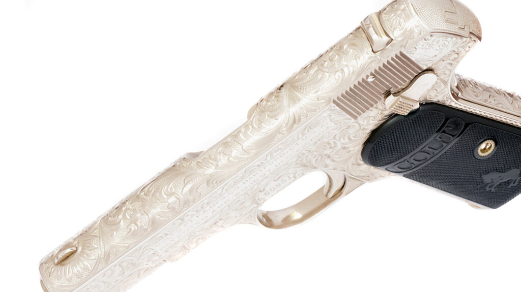 The sides of the frame, the bottom of the trigger-guard, the bottom of the grip and the mainspring housing were also decorated in a similar scroll pattern. Both the slide stop and safety lock could have light engraving as well, and the edges of the frame above and behind the trigger were finely checkered. The most highly engraved 1911 examples were the Colt National Match .45s, which were produced from 1933 through 1941. Approximately 25 were done with almost full coverage.