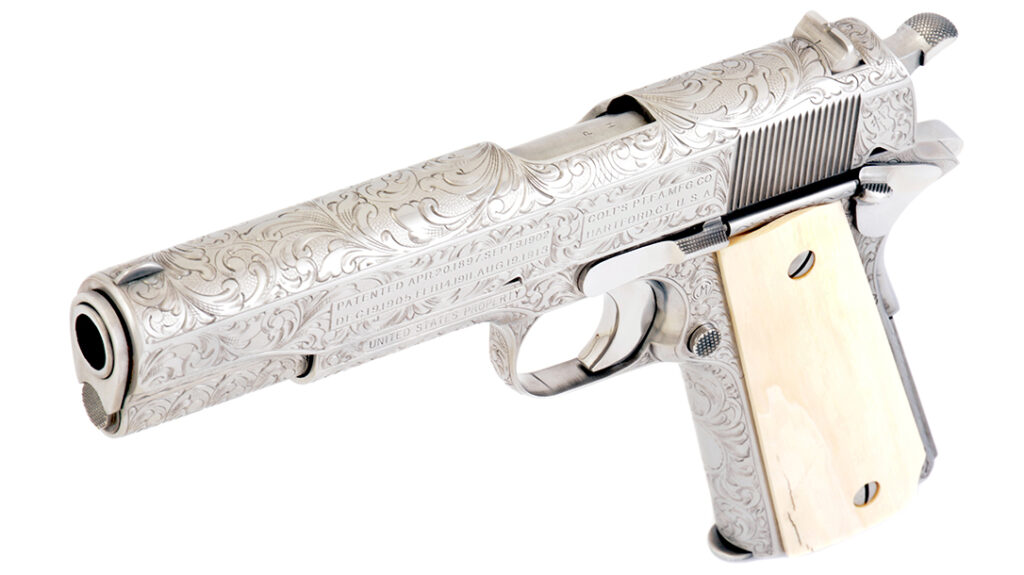 The hand engraved, nickel-plated and hand-carved ivory-stocked 1911 pictured above, the third in our American Trio, is highly representative of Colt factory engraving seen on 1911 models from the early1920s (principally the Colt National Match .45s) and showcases styles that are still used to this day by Colt factory engravers. Like the 1873 and 1908 Colts, the engraving incorporates the classic scrollwork patterns and punch dot backgrounds pioneered by the greatest 19th century Colt engravers, making this 20th century gun and the matching 1873 and 1908 Colts not only firearms, but modern works of art.