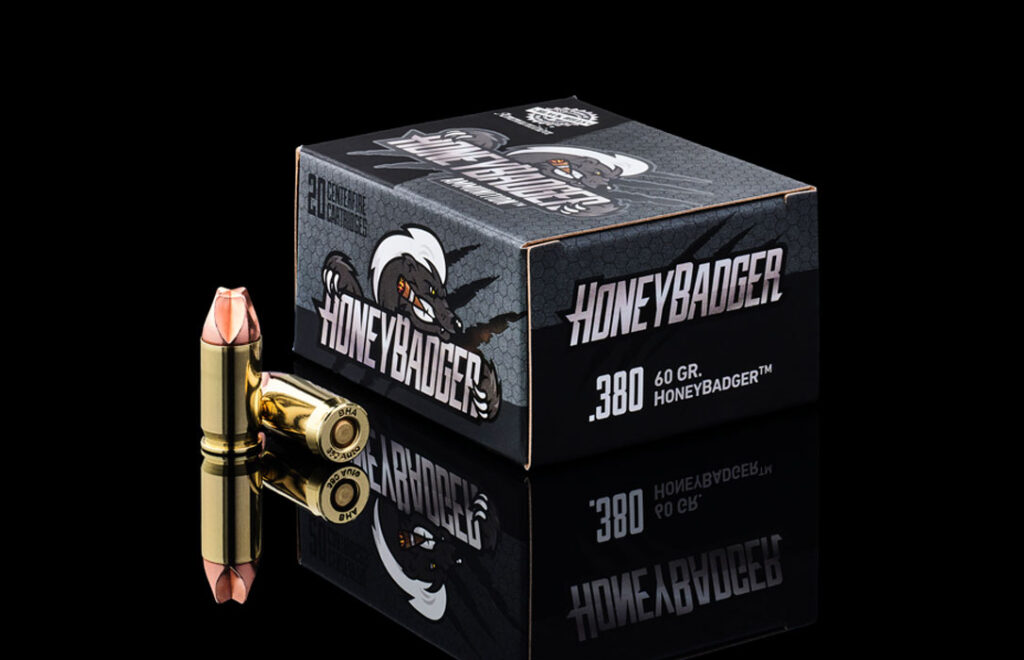The .380 ACP has become an incredibly popular defense tool in the last 10 years. The best gun for a gunfight is the one you have with you. In many cases that tends to be a .380 pocket pistol. They are small and concealable pistols, but to be effective, you need the best ammunition possible. Black Hills Ammunition’s HoneyBadger is that ammunition. It does not rely on a hollow point design which can fail to expand or plug with clothing. Instead, it uses a homogenous copper projectile with cutting edges on the forward surface and flutes on the ogive that redirect the tissue as it impacts and penetrates at a velocity of over 1150 fps. This is superior design in terms of reliability and effectiveness.
