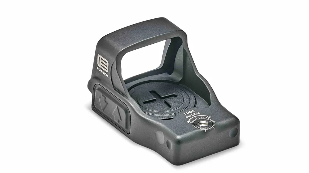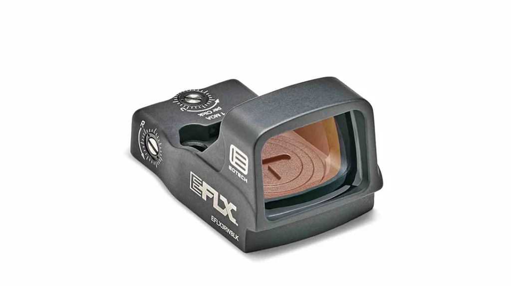 The EFLX is available in either 3- or 6-MOA aiming dot models. A 3-MOA dot improves precision on close-range targets, while the larger 6-MOA dot is quicker to find. Shooter preference, target size and engagement distance are critical factors in selecting the best aiming dot size. The sight’s windage and elevation are adjustable in 1-MOA clicks for rapid zeroing.