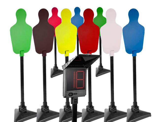 The kit includes the weighted base, the target stand and targets all made from the same high-density polymer for extended use and durability. Most interesting, however, is the variety of the targets themselves. There are reactive targets that fall down when shot with adjustable sensitivity (fall when shot once or only when shot multiple times), reactive targets that scream when shot (you can use one of their screams or record your own), low-light targets that flash when hit or simulate enemy fire, and target counters that digitally display the number of hits.