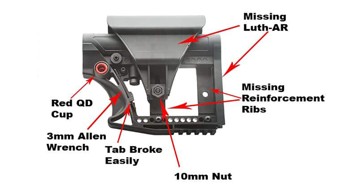 “There are Luth-AR MBA Buttstock knockoffs being offered on some of these platforms,” Luth-AR said in a statement. “Warning signs to look for is that they may be labeled as ‘Luth Style.’ These are of unknown quality, unauthorized and counterfeit products. They will not come in the correct packaging and will not have quality printed instruction manuals. They will most likely be offered at prices well below our advertised price. Some have actually stolen our published product images to further deceive the purchaser.”