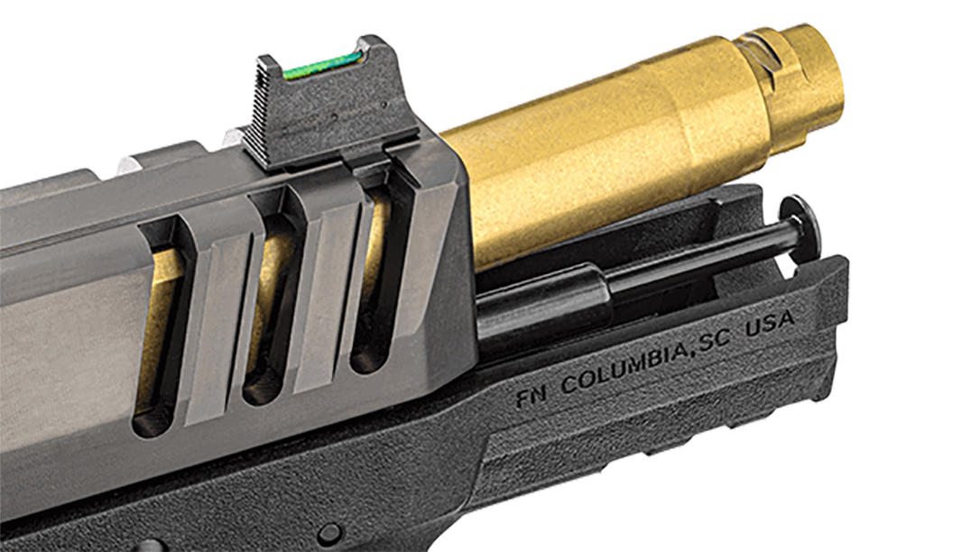 The compensator increases performance by reducing muzzle rise by around 25 percent, according to FN. It decreases felt recoil, while still maintaining concealed carry traits. The system utilizes V-style ports on either side; the vector gases and flash out of the shooter’s field of view. FN machines the compensator from stainless steel. It comes coated with a graphite-colored PVD finish for durability and hard use. All the while, the system maintains the factory FN 509 recoil spring.