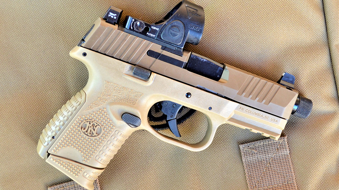 My test pistol possesses an FDE finish with parts like the magazine release, takedown lever, barrel and extractor finished in black for a pleasing contrast. FN America outfits the slide with Trijicon Tritium suppressor height sights. Meanwhile, the slide cap has raised wings to protect the rear sight from blows that might affect its zero. FN’s Low Profile Mounting System enables the platform to accept more than 10 different miniature red dots and includes mounting plates with the gun.