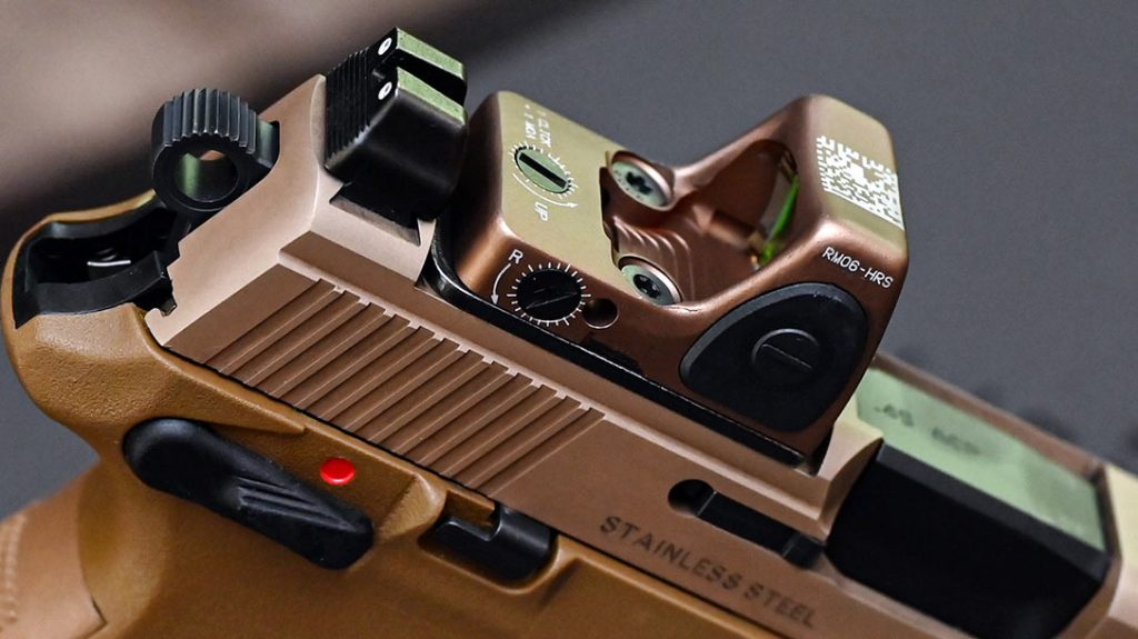 If you are a fan of red-dot sights, you will be happy to find the top of the slide is cut for a red-dot plate. FN includes two mounting plates in the package, which allow you to attach anything with a Trijicon RMR footprint or Docter optic footprint.