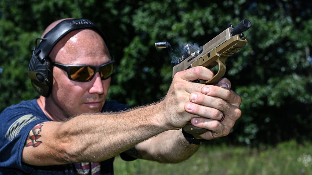 The tritium night sights are already suppressor ready, so you don’t have to change anything to run the gun suppressed. I shot the FNX-45 Tactical with a SilencerCo Hybrid 46 and a GSL Python. They both sat well below the iron sight picture and allowed me to comfortably shoot the pistol with a good sight picture.