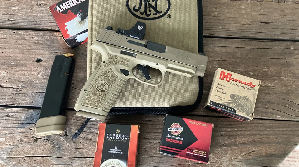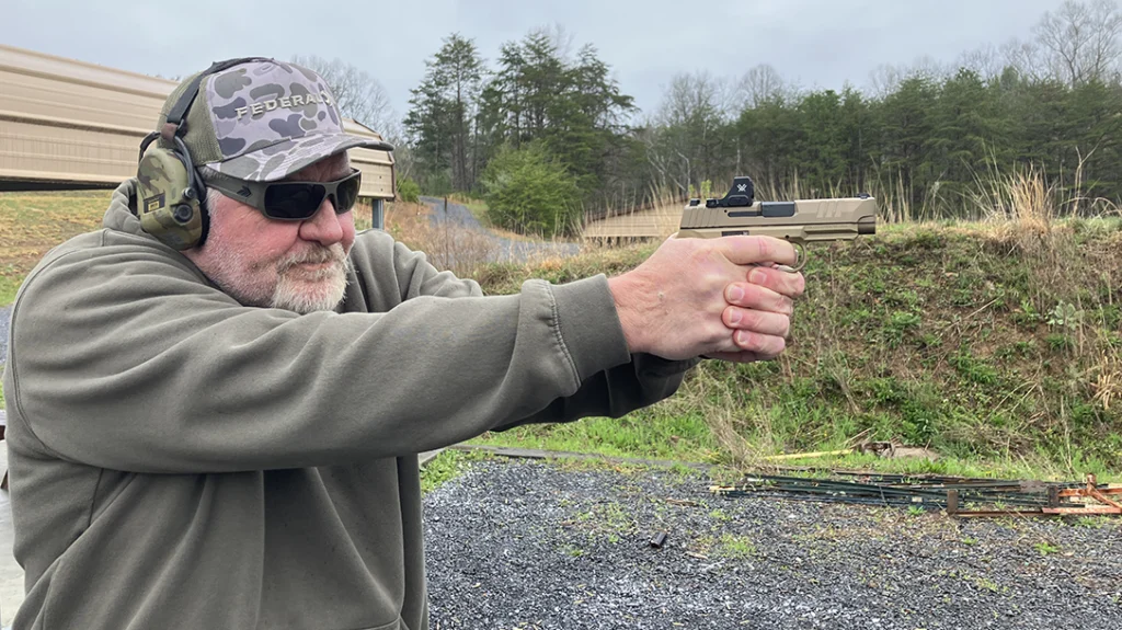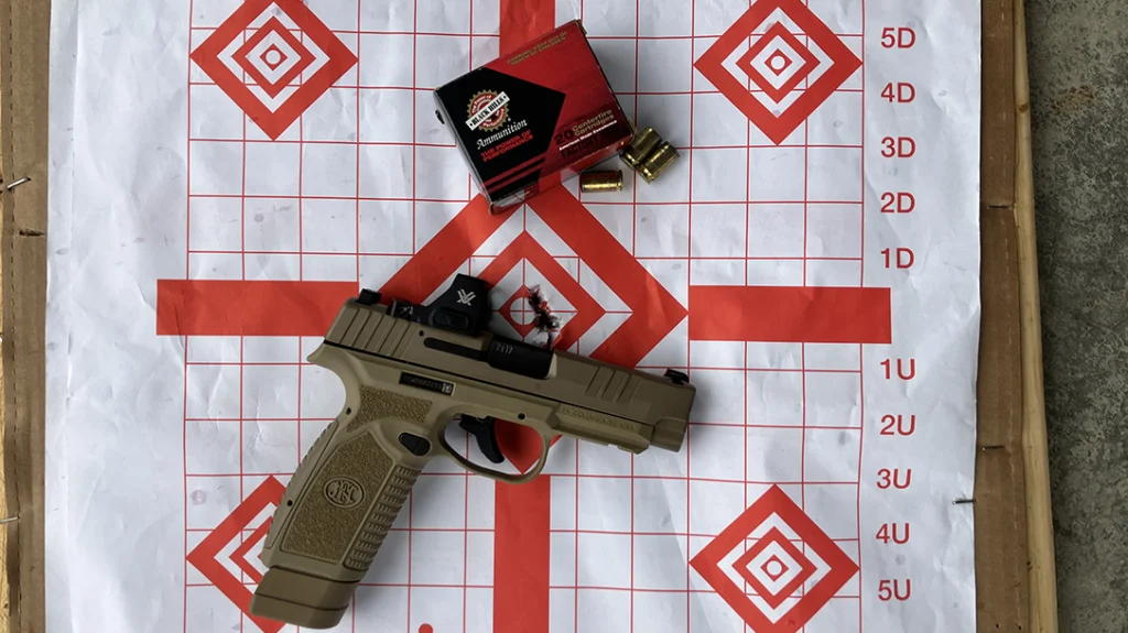 The natural point ability of the Reflex XL comes into its own in this realm with the Vortex Defender red dot doing its part as well. The Vortex Defender’s rectangular lens offers a superior field of view compared to other red dot options. The Defender’s minimal frame “disappears” when focusing on the target with the red dot. The red dot was “there” and seamlessly located at the first draw. This is a compliment to FN choosing a direct mount method versus plates allowing the red dot to sit as low as possible on the slide.