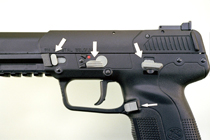 The slide latch is at the top of the grip on the left side. The manual safety, located above the trigger, has levers on both sides. The left one is easily operated by the thumb of the supporting hand, and the one on the right by the trigger finger, the off-safe movement is downward and a red dot is exposed.