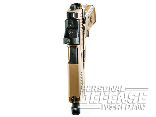 The pistol’s controls are ambidextrous and designed so the more important controls—the magazine release and decocking lever—are more prominent than the slide stop. That’s also why the slide stop is surrounded by a small ridge. The decocker is placed under the thumb of the shooting hand, a natural location. The decocking lever has two functions: to decock the hammer from SA mode and to place the pistol on “safe” when in DA mode. It functions like a 1911 thumb safety. The up position is “safe” and the down position is “fire.” A red warning dot is exposed when the lever is placed in the “fire” position.