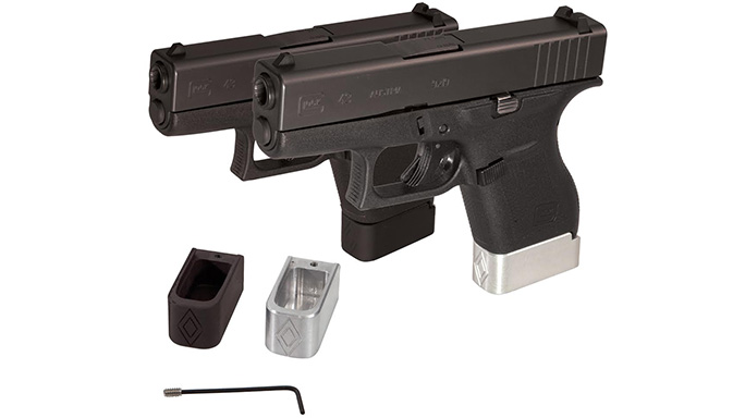 Depending on the model, GlockStore’s Double Diamond Glock 43 magazine extension adds either one or two rounds to the existing six-round magazine. It also provides just the right amount of extension to offer a “full hand” grip on the gun.
