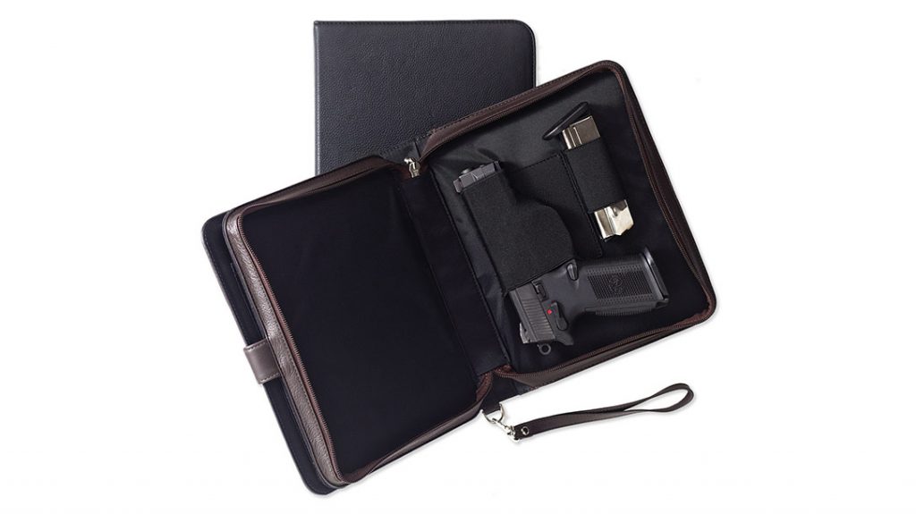 Filling the mid-size category, the Hidden Agenda also doubles as a fully functional day planner. Placing the firearm and spare magazines in a separate compartment from the business tools allows for discreet use. As a result, you can still open your planner in a meeting, without unintentionally exposing your defensive pistol. The Hidden Agenda also comes with a Day Runner calendar and pad of ruled paper.