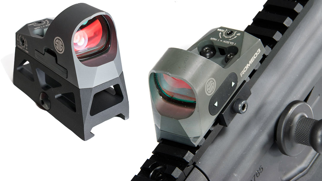 With hundreds of different optic options on the market, why choose the Sig Romeo? The ROMEO3 is a very competent reflex sight. It features a brilliant 3 MOA dot, powered by a single CR2032 battery, phosphorescent brightness controls, and two different mounts. The Romeo comes installed with a quick-detach mount set to the standard AR-15 iron sight height for easy co-witnessing.