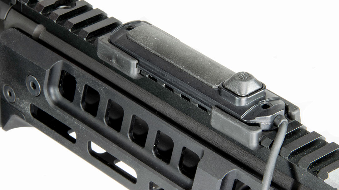 In the shown configuration, the Galil ACE features the pressure switch for the ProTac 2 on the gas tube rail. To ensure that while using the thumb-over-bore technique, the shooter can reliably actuate their tactical light every time, they need a physical point of reference for the support hand.
