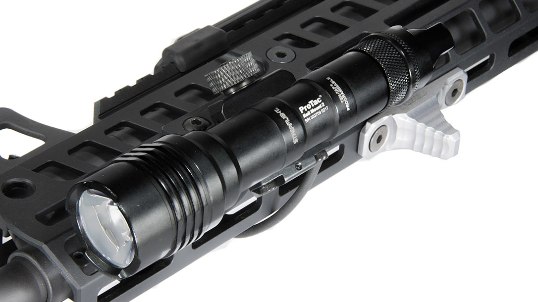 Running off a pair of CR123A lithium batteries, the ProTac 2 blasts 625 lumens of eye-searing light from its LED emitter on high mode. While operating in this high-performance mode, the ProTac can throw light out to 297 meters for two hours straight. On low, the light’s range is reduced to 89 meters at 60 lumens but runs for an astonishing 21 hours.