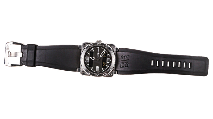 The BR03’s 42mm brushed and polished steel case encases a black digital dial under a scratch-resistant sapphire crystal. It has multifunction features (alarm, chronograph, second time zone), a black rubber strap, is water resistant to 330 feet, and has luminescent hands and markers.