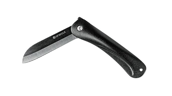 This compact, non-metal, black ceramic knife is lightweight and has soft grip handles.