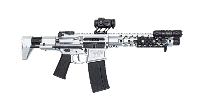 The foundation for the Rainier Arms PDW is the Rainier Arms Ultra Match Mod 3 billet upper and lower receiver set. The Mod 3 lower is made of 7075-T6 aircraft-grade aluminum and is all kinds of sexy. It has sleek yet aggressive lines and sports some unique features. The front of the magazine well has an aggressive grip milled into it for shooters who prefer to use the front as a grip, and the well itself is flared for quicker magazine changes.