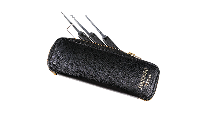 This 14-piece lock pick set includes nine lock picks, a broken key extractor, four tension tools, nine textured slide-on grips, and a top-grain zippered leather case.