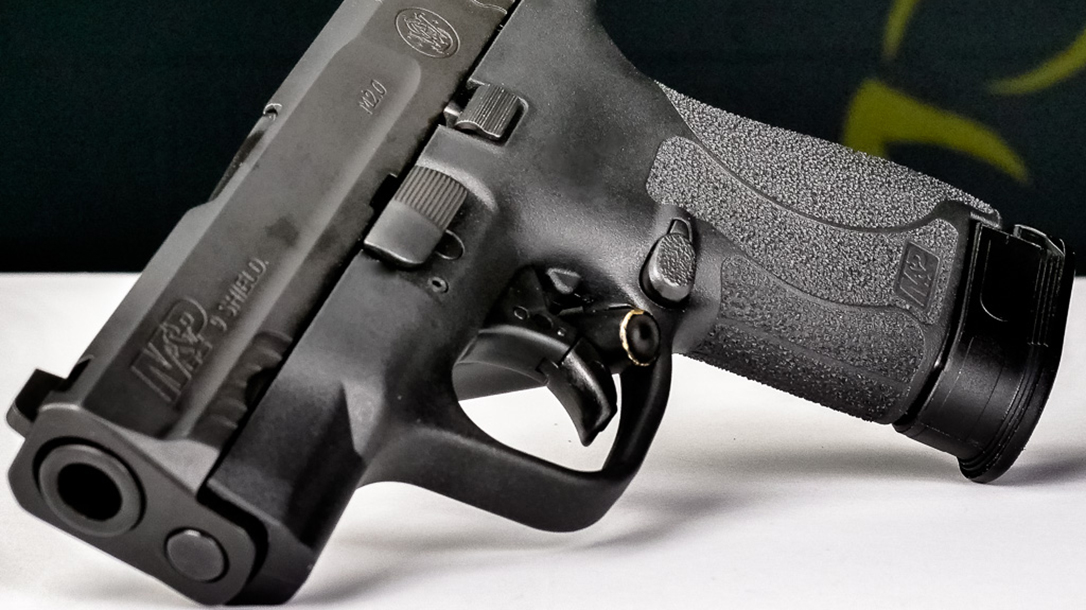 The Shield-sized gun is chambered in .380 ACP, with 8+1 capacity; a Picatinny rail; white-dot front and adjustable white-dot rear sights; one-piece, single action trigger; loaded chamber indicator; tapered rear slide serrations; M2.0 enhanced grip texture; reversible magazine release; grip safety and the option of adding an ambidextrous, manual thumb safety.