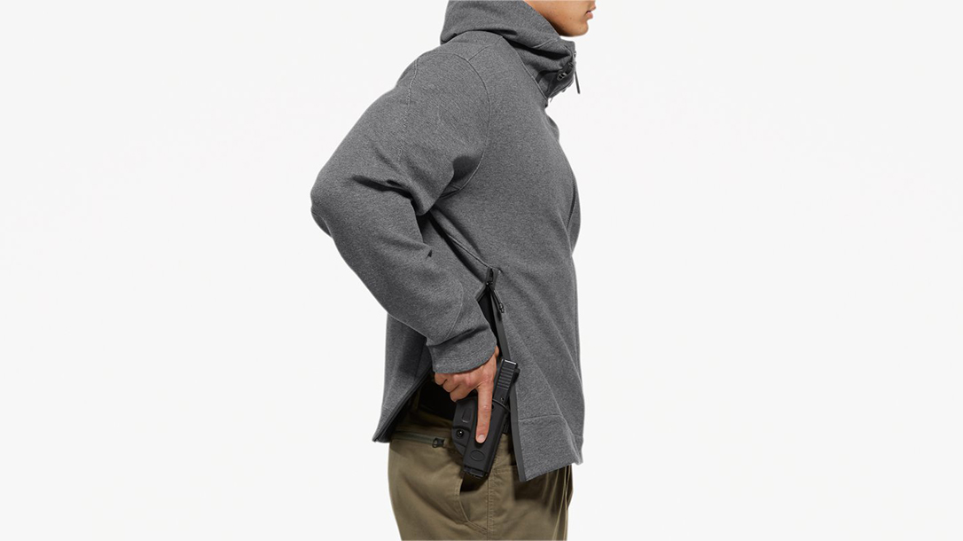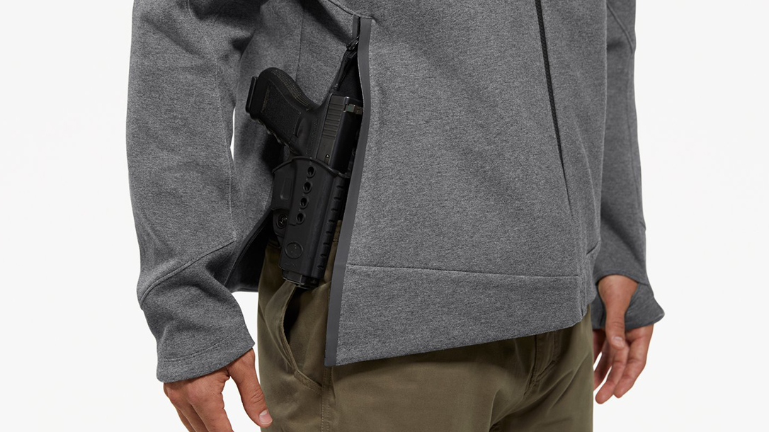 The EDC Tech Fleece is a poly/cotton fleece blend with spandex to providing both mobility and warmth, and an oversized cinchable hood. You can get all of that in a North Face, but Viktos throws in a little something extra. The front pocket allows sidearm access with interior zippered pockets and the side access zipper make it easy to grab that gun from appendix, all the way around to a six o’clock position.
