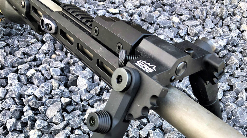 This change in position from the traditional under-mount bipod gives greater stability. My competition rifle is quite heavy. Using a spindly under mount creates a lot of lateral movement. With the center line under the rifle, it is rock solid and ready to go.