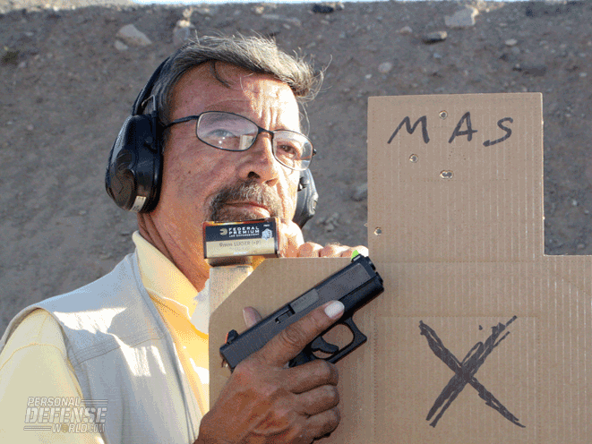 The Glock 26 Gen4 I won at that match and tested for this article didn’t shoot as well out of the box. I was getting 5-inch groups when I gave it an initial test drive, and I set it aside to test later. Time ran out: My deadline was approaching when I had to take off for Arizona to teach a couple of classes. My friend Allen Davis, a Glock armorer, was kind enough to install the Firefly sights in time for me to shoot it for a few minutes, then get it into the suitcase and head for the airport.