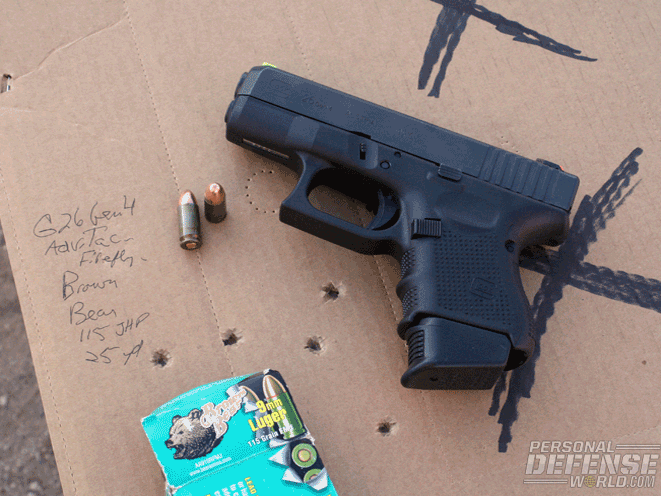 The other load tested with the Firefly/Glock 26 Gen4 combo was the Russian-made Brown Bear 115-grain FMJ. Strangely enough, this was the only load we fired through the pistol that went laterally from point of aim, distinctly to the left. However, the group made the service pistol accuracy standard of 4 inches at 25 yards, despite the short sight radius of a manufacturer-designated “subcompact” concealment gun as opposed to a full-size duty pistol. The five-shot group measured 3.88 inches, with four of the bullet holes 3.25 inches apart. However, the best three-shot group measured 1.94 inches.