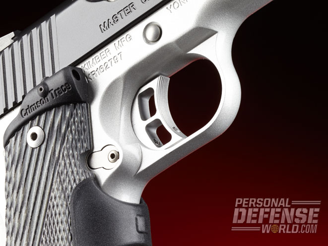 A recessed slide stop shaft and really nice looking Crimson Trace Master Series G10 Lasergrips complete the frame. Crimson Trace’s Lasergrips are standard thickness and length, secured with stainless hex screws and have the lower rear corners contoured to match the Kimber Round Heel frame. Recessing the slide stop shaft eliminates possible interference with the laser beam.