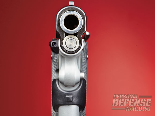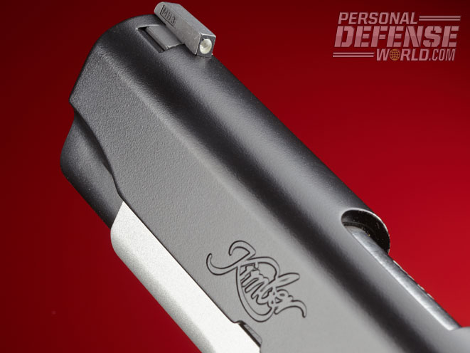 A match-grade, stainless steel bull/cone barrel is mated directly to the abbreviated stainless steel slide and uses a full-length recoil spring guide rod inside the 22-pound recoil spring. The slide is coated black with KimPro II, a polymer finish Kimber describes as “tough and self-lubricating” and which “offers outstanding resistance to chemicals, moisture, salt and UV light.” Of all the properties listed, the self-lubricating feature may be the most important as it provides a smoother-running slide.