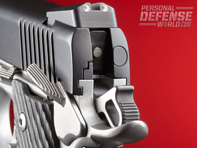 A long, aluminum, skeletonized trigger, complete with overtravel adjustment, works with the hammer to produce a trigger pull weight of a crisp 4.6 pounds, which is not bad for a production pistol. The thumb safety is extended and slightly widened, all without making it cumbersome. Kimber’s magazine release is slightly extended compared to traditional versions. However, all my 1911s have the same extended magazine release and they have never caused a single problem after years of carry.