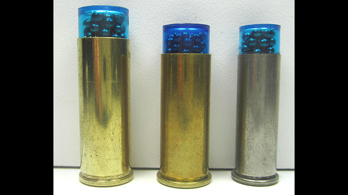 For versatility, I used some .45 ACP bullets. The only thing is you have to put a cannelure on the bullet. Failure to do that will result in bullets walking, and in a tubular magazine they will be shoved down into the case. I use a CH tool, and it isn’t very hard to perform that task. For those who don’t like to use lead slugs, another option are the copper-plated slugs produced by a couple of makers; Berry and Ranier are two of the most common. The problem is that they also lack a cannelure, and for best results one should be installed. Since they are soft, a cannelure is easy to install; just be careful not to make it too deep.
