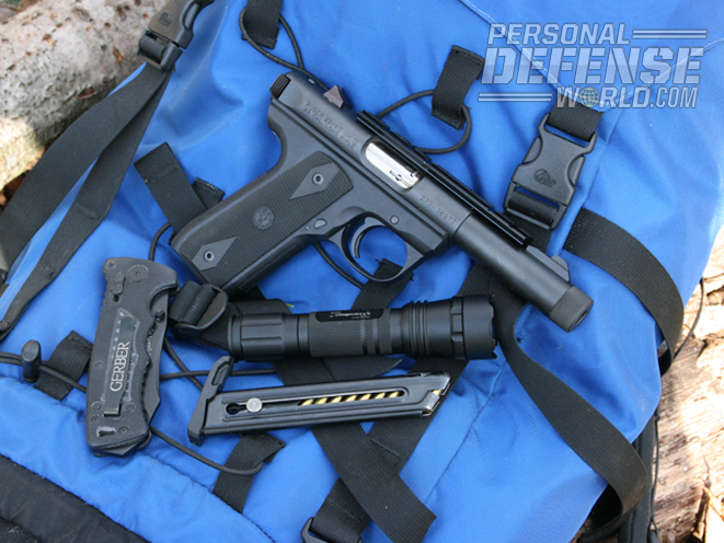 A lightweight .22 LR pistol like the Ruger 22/45 can fit into anyone’s bug-out bag, and as a trail gun it takes no effort to carry.